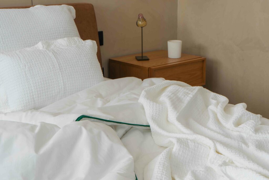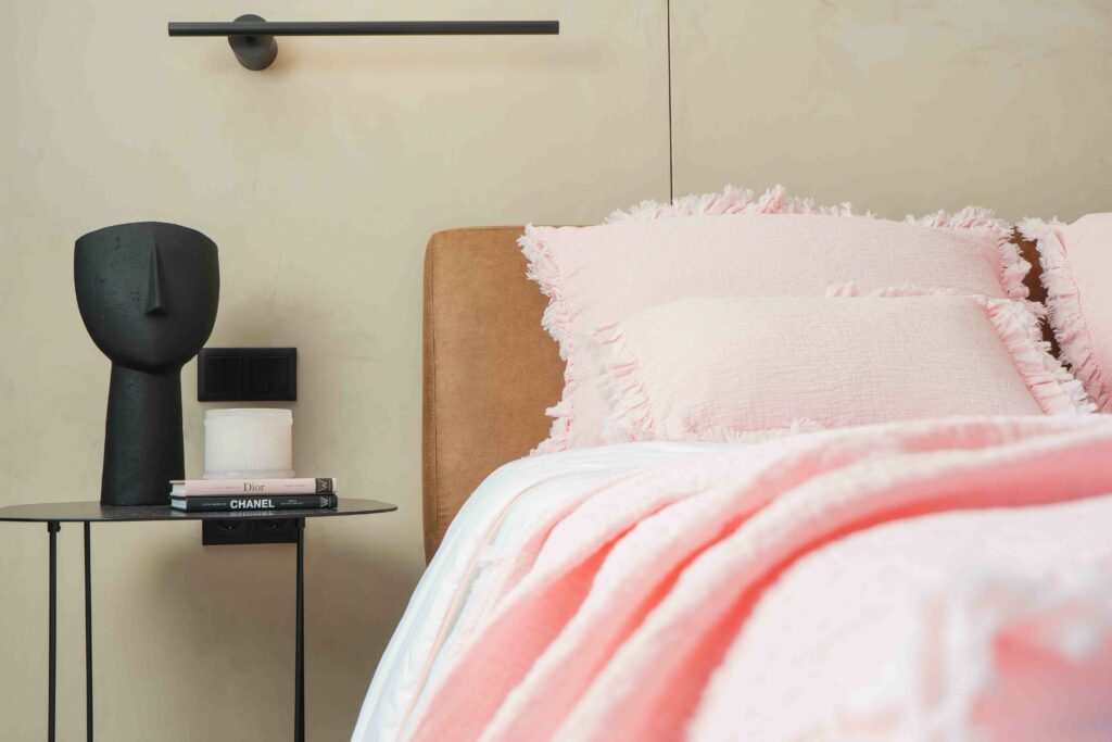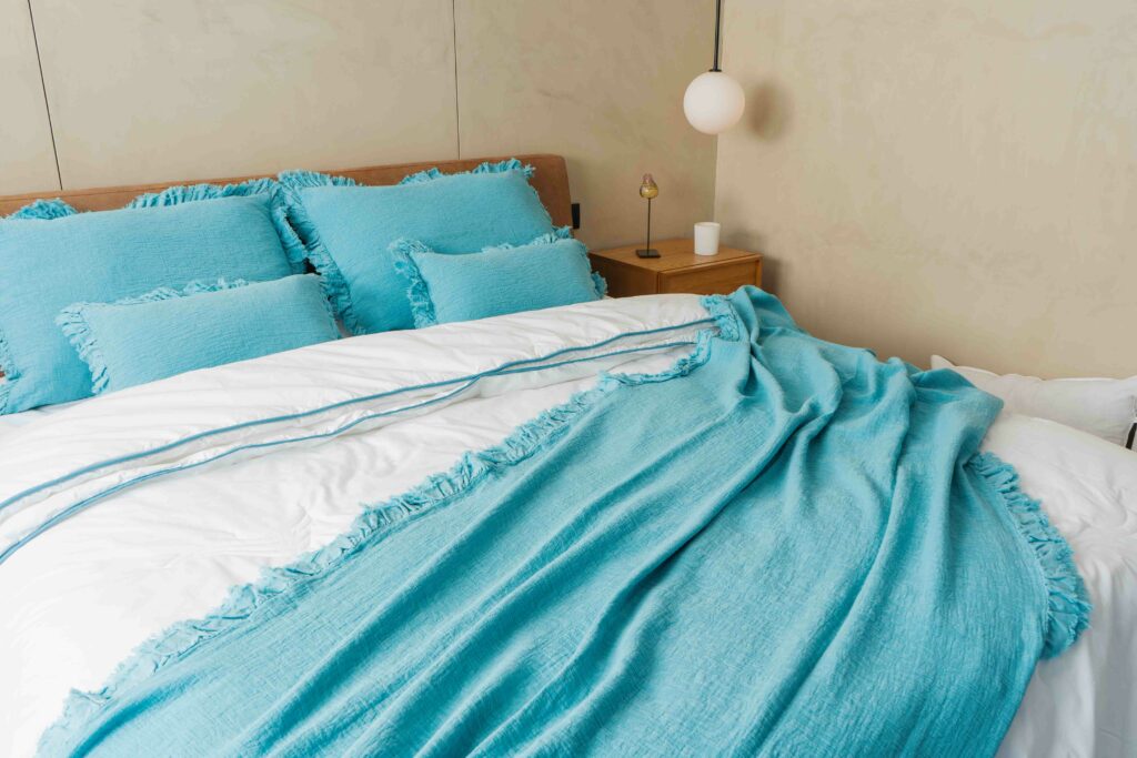 Se optar por almofadas com um toque de cor como azul ou rosa, pode complementar com uma manta tapa-pé no mesmo tom, criando um elo de ligação no quarto e um ambiente elegante, sofisticado e acolhedor.